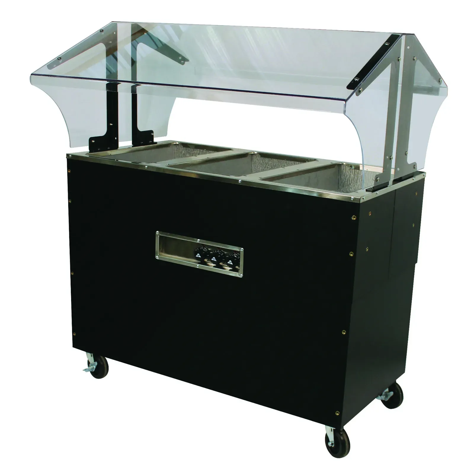 Maximize efficiency with the Advance Tabco Portable Hot Food Buffet Table. Designed specifically for restaurant settings, this versatile unit measures 47-1/8"W x 35"D x 53"H, making it an ideal choice for serving hot dishes in a compact space. The double-sided sneeze guard ensures hygiene and safety, allowing guests to serve themselves from both sides without compromising cleanliness. The Portable Hot Food Buffet Table features three 12" x 20" galvanized wells, which require spillage pans to maintain optimal food quality and temperature. Each well is equipped with individual infinite controls and indicator lights, giving you precise control over the heat settings for different dishes. The enclosed base provides additional storage space, keeping your serving area organized and clutter-free. The black vinyl clad finish adds a sleek, professional look to your restaurant, while the 4" swivel casters, including two with brakes, offer easy mobility and stability. This unit is UL and NSF certified, ensuring it meets the highest standards for safety and sanitation in food service environments. Whether you're hosting a buffet, catering an event, or simply need a reliable hot food station, the Advance Tabco Portable Hot Food Buffet Table is the perfect solution. Enhance your restaurant's efficiency and presentation with this high-quality, durable unit.