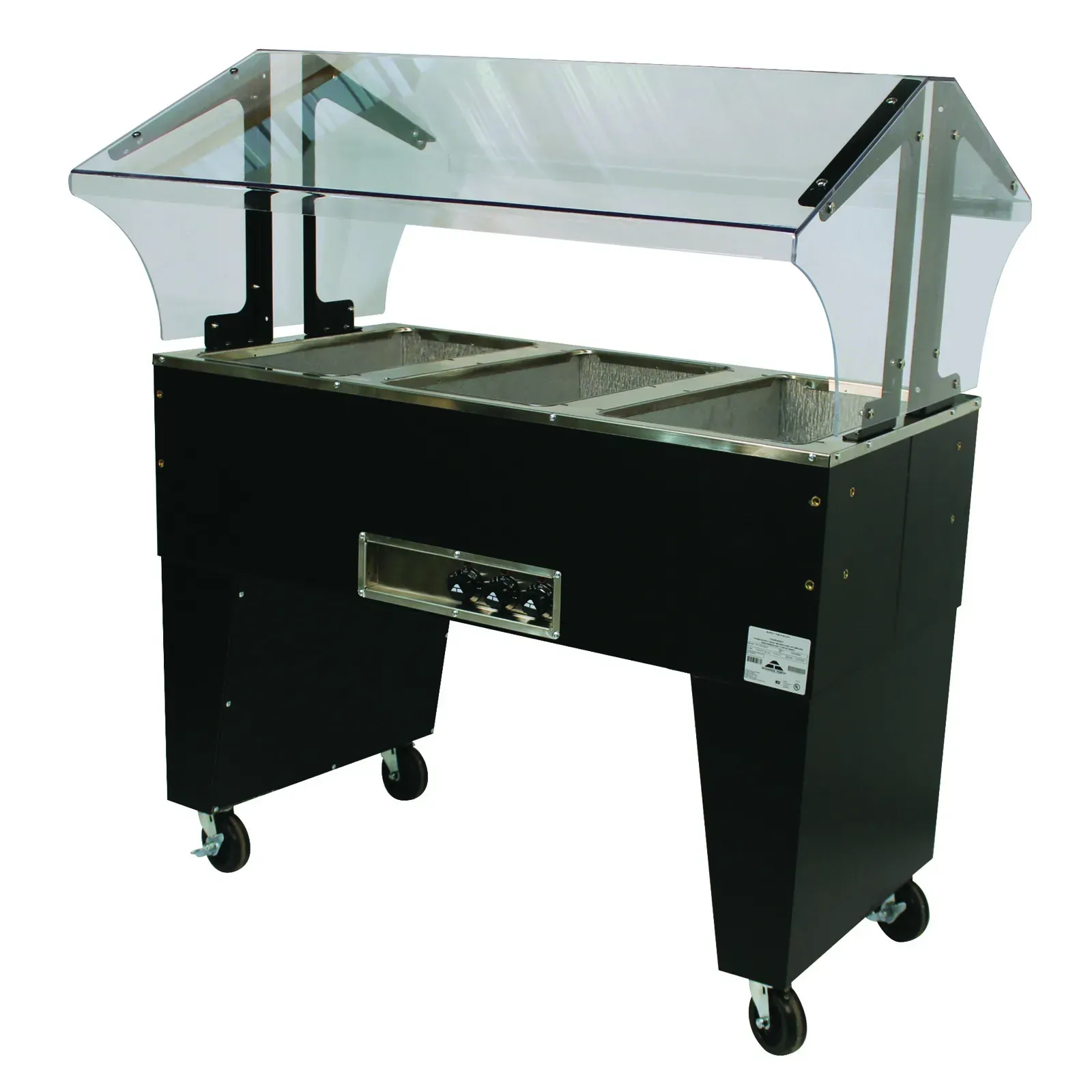 Enhance your workspace with the Advance Tabco Portable Hot Food Buffet Table. This versatile and efficient unit, model B3-240-B-S, is designed to meet the high demands of a bustling restaurant environment. Measuring 47-1/8" wide, 35" deep, and 53" high, this buffet table offers ample space for serving a variety of hot dishes. The Portable Hot Food Buffet Table features three 12" x 20" stainless steel wells, perfect for keeping your food at the ideal temperature. Please note that spillage pans are required for optimal performance. Each well is equipped with individual infinite controls and indicator lights, allowing for precise temperature management to ensure your dishes are always served at their best. A double-sided sneeze guard provides an added layer of hygiene, protecting your food from contaminants while allowing easy access for both staff and customers. The open base design offers convenient storage space, and the black vinyl clad finish adds a touch of elegance to your dining area. For ease of mobility, the buffet table is fitted with 4" swivel casters, two of which come with brakes to secure the unit in place when needed. This model is UL and NSF certified, ensuring it meets the highest standards of safety and sanitation. Upgrade your restaurant's serving capabilities with the Advance Tabco Portable Hot Food Buffet Table, model B3-240-B-S, and experience the perfect blend of functionality, style, and reliability.