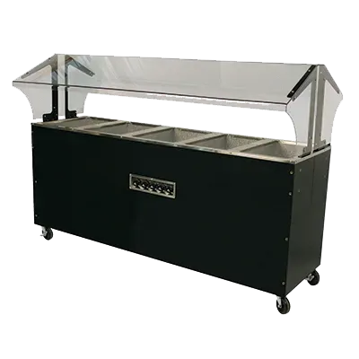 Boost functionality in your workspace with the Advance Tabco Portable Hot Food Buffet Table. Designed to meet the rigorous demands of a bustling restaurant environment, this versatile unit measures 77-3/4" wide, 35" deep, and 53" high, making it an ideal addition to any dining area or catering setup. The Portable Hot Food Buffet Table features a double-sided sneeze guard, ensuring food safety and hygiene from both sides of the table. Equipped with five 12" x 20" galvanized wells, this buffet table requires spillage pans to maintain cleanliness and efficiency. Each well is controlled individually with infinite controls and indicator lights, allowing precise temperature management for a variety of dishes. The enclosed base provides a sleek, professional appearance, complemented by a black vinyl clad finish that adds a touch of elegance to your establishment. Mobility is a breeze with the 4" swivel casters, two of which come with brakes for secure positioning. Certified by UL and NSF, this electric buffet table operates on 208-240 volts, ensuring reliable performance in any commercial setting. The Advance Tabco Portable Hot Food Buffet Table, model B5-240-B-SB, is the perfect solution for keeping your hot foods at the ideal serving temperature while maintaining a clean and organized presentation. Enhance your restaurant's service capabilities with this high-quality, durable buffet table from Advance Tabco, designed to meet the needs of any foodservice operation.