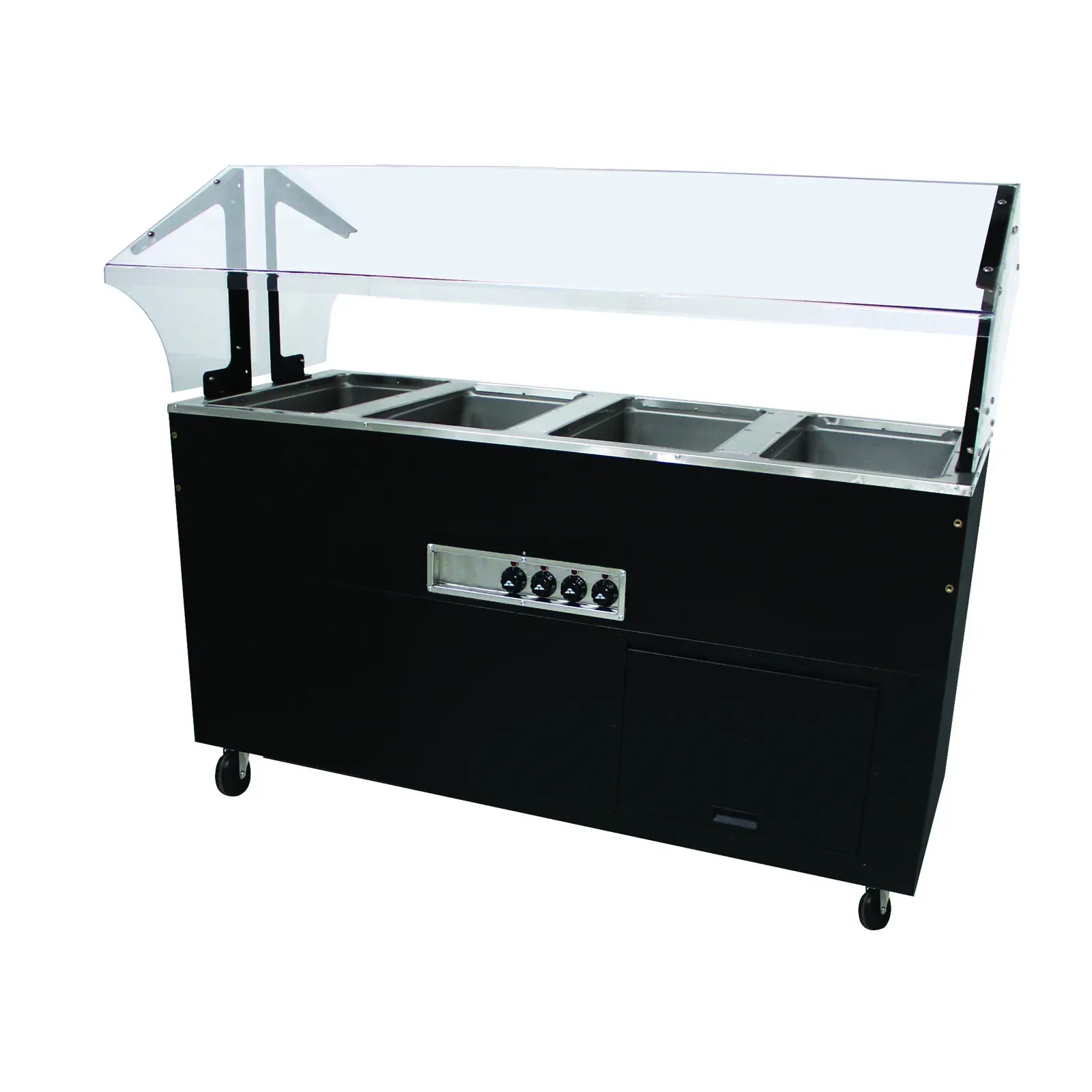 Achieve greater efficiency using the Advance Tabco Portable Hot Food Buffet Table. This top-of-the-line buffet table, model BSW4-120-B-SB, is designed to meet the high demands of a bustling restaurant environment. Featuring a durable stainless steel top and a sleek matte black vinyl steel clad body, this buffet table is both stylish and functional. The Portable Hot Food Buffet Table comes equipped with four 12 x 20" hot food wells, each capable of accommodating pan inserts up to 6-1/4" deep. These sealed wells with manifold drains ensure easy cleaning and maintenance, while the fiberglass insulation between wells helps maintain consistent temperatures, keeping your food hot and ready to serve. Infinite controls allow for precise temperature adjustments, ensuring that each dish is served at its optimal temperature. The included food shield, with a thermoplastic top and acrylic end panels, provides an added layer of hygiene, protecting your food from contaminants. Designed with mobility in mind, this buffet table features a solid base and 4" swivel casters with two brakes, allowing for easy transport and secure placement. The removable front panel offers convenient access for cleaning and maintenance, making this unit as practical as it is efficient. Certified by NSF and UL (120v), the Advance Tabco Portable Hot Food Buffet Table is a reliable and safe choice for any restaurant looking to enhance its buffet service. Invest in this high-quality buffet table to streamline your operations and deliver an exceptional dining experience to your guests.
