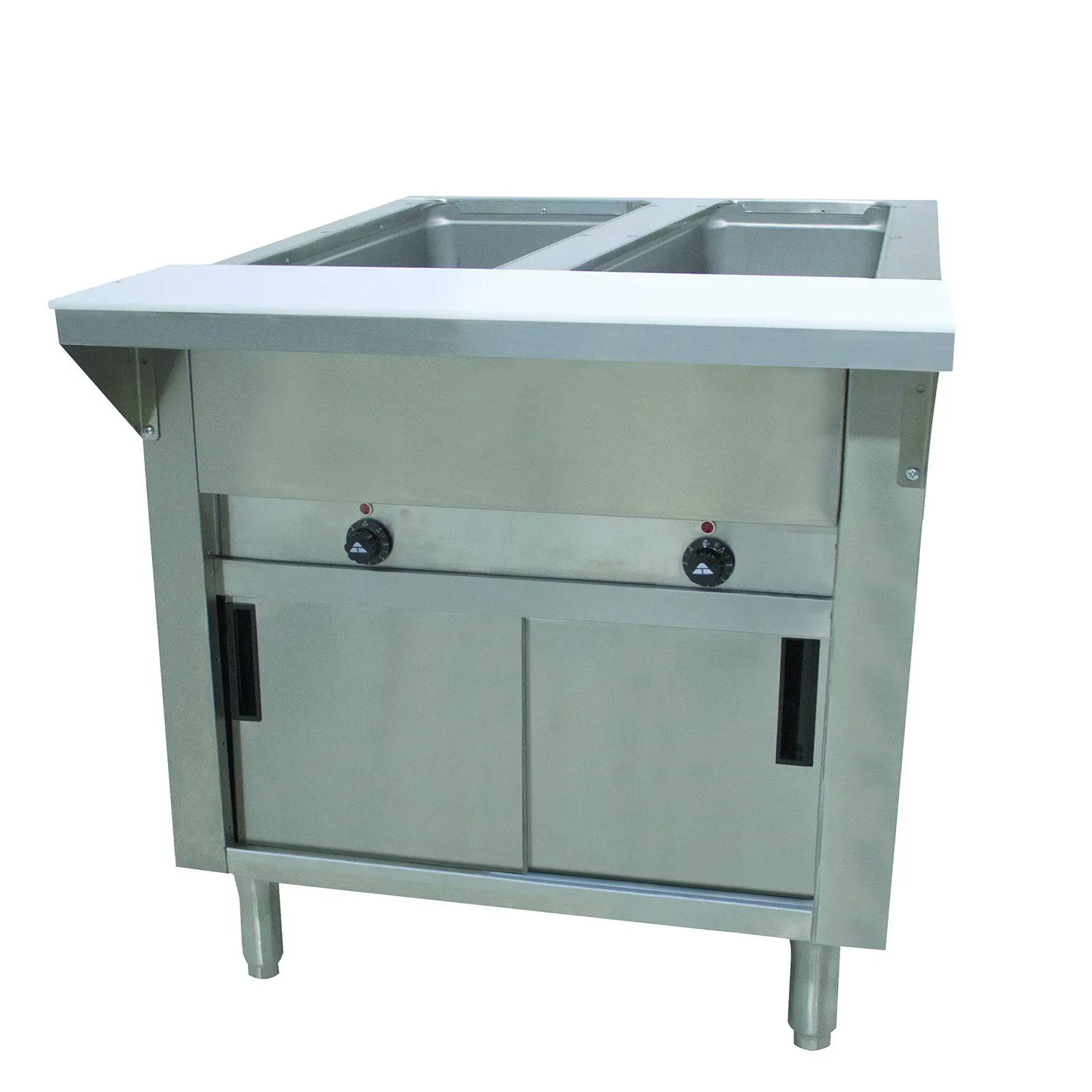 Maintain top hygiene standards using the Advance Tabco Hot Food Table. Designed specifically for restaurant settings, this high-quality unit ensures your hot dishes are served at the perfect temperature while maintaining a clean and organized kitchen environment. The Advance Tabco Hot Food Table, model HF-2E-120-DR, boasts impressive specifications: it measures 31-13/16" wide, 30-5/8" deep, and 34-1/8" high. This compact yet spacious design fits seamlessly into any kitchen layout, providing ample space for food preparation and storage. Equipped with (2) 12" x 20" wells, the Hot Food Table accommodates pan inserts up to 7-3/4" deep, allowing for versatile food holding options. Each well features individual infinite controls, giving you precise temperature management for different dishes. The stainless steel top ensures durability and easy cleaning, essential for maintaining hygiene standards in a busy kitchen. The unit also includes a stainless steel 8D support shelf with a removable 3/8" thick poly cutting board, offering additional prep space and convenience. The stainless steel cabinet base with (2) sliding doors provides ample storage for kitchen essentials, keeping your workspace organized and clutter-free. Certified by UL and NSF, the Advance Tabco Hot Food Table meets the highest safety and sanitation standards, making it a reliable choice for any restaurant. With its robust construction and thoughtful design, this hot food table is an indispensable addition to your kitchen, ensuring efficiency and quality in every service.