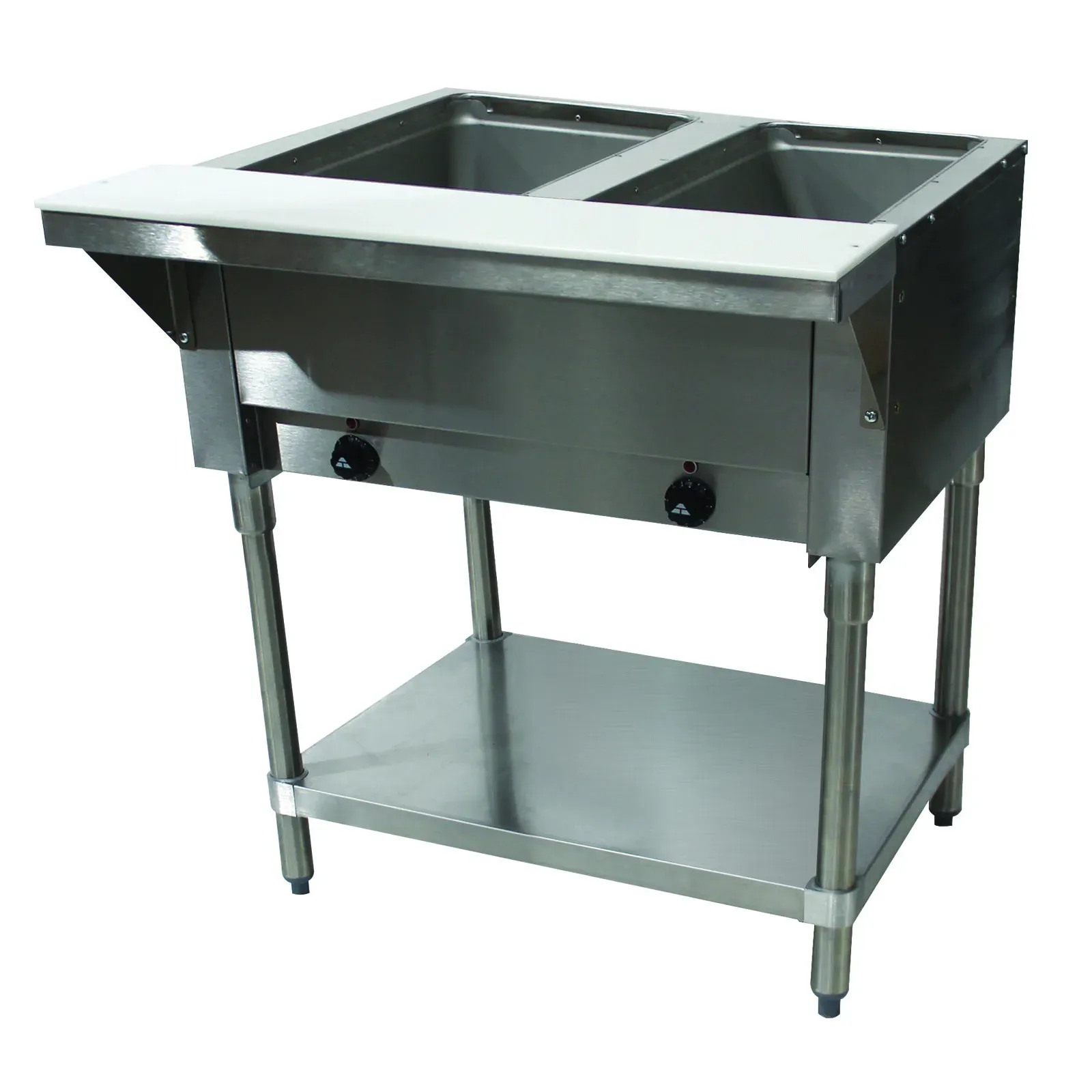 Support daily operations with the Advance Tabco Hot Food Table, a reliable and efficient solution for maintaining food at optimal serving temperatures. This model, SW-2E-120, is designed to meet the rigorous demands of a busy restaurant environment. With dimensions of 31-13/16"W x 30-5/8"D x 34-1/8"H, it fits seamlessly into your kitchen layout while providing ample space for food preparation and service. The Advance Tabco Hot Food Table features (2) 12" x 20" sealed wells, each equipped with individual drain valves, accommodating pan inserts up to 6" deep. This design ensures easy cleaning and maintenance, allowing you to focus on delivering exceptional meals to your customers. The individual infinite controls with indicator lights offer precise temperature management, ensuring your dishes are always served at the perfect temperature. Constructed with stainless steel well liners, this hot food table is built to withstand the demands of a commercial kitchen. The 3/8" thick poly cutting board provides a convenient surface for food preparation, while the galvanized open base with an undershelf offers additional storage space for your kitchen essentials. Certified by UL and NSF, the Advance Tabco Hot Food Table meets the highest standards of safety and sanitation, making it a trusted choice for any restaurant. Enhance your kitchen's efficiency and ensure your food is always served hot and fresh with the Advance Tabco Hot Food Table, model SW-2E-120.