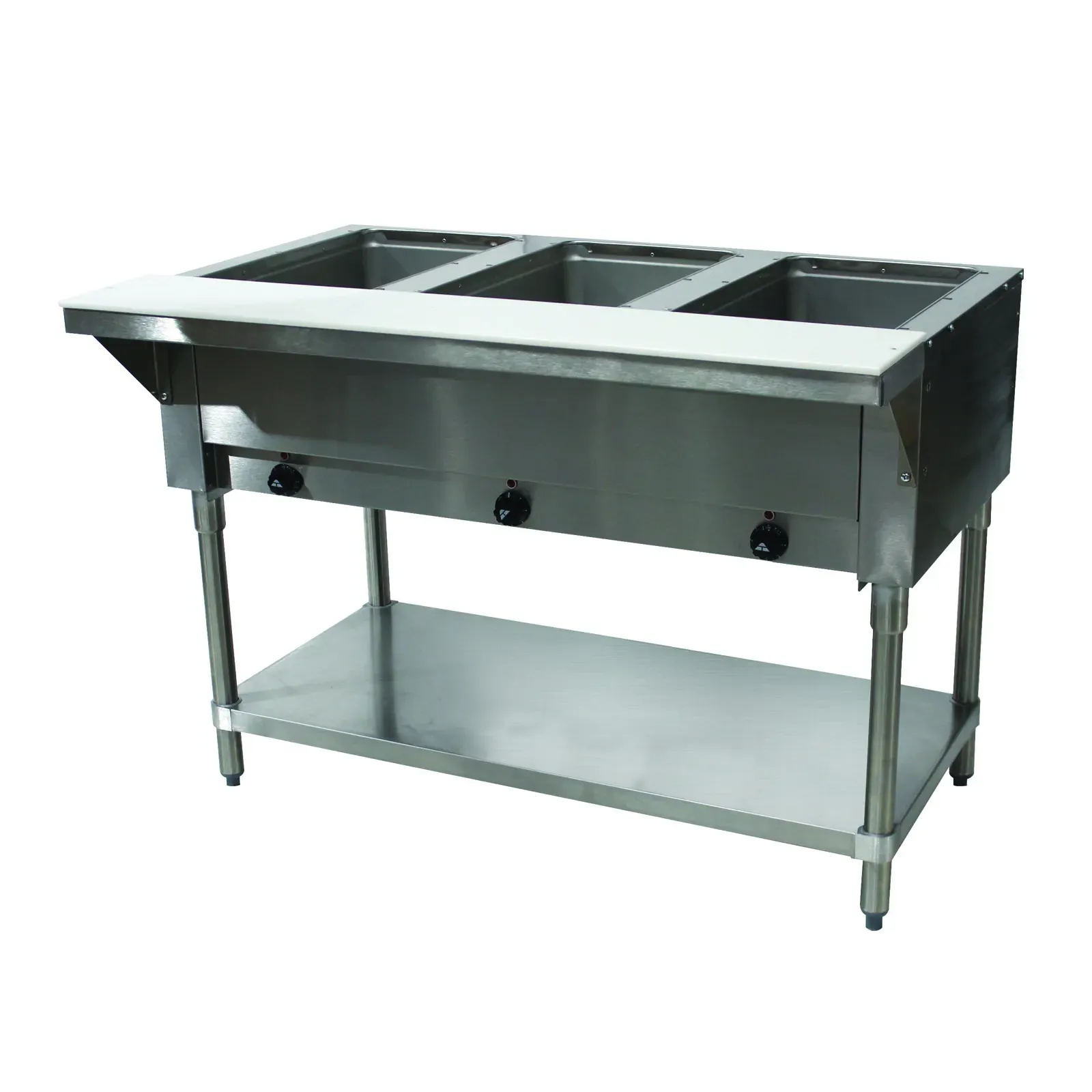 Keep your kitchen running smoothly with the Advance Tabco Hot Food Table. Designed to meet the rigorous demands of a bustling restaurant, this electric hot food table boasts a compact yet spacious design with dimensions of 47-1/8"W x 30-5/8"D x 34-1/8"H. The Advance Tabco Hot Food Table features three 12" x 20" sealed wells, each equipped with individual drain valves, allowing for easy cleaning and maintenance. These wells can accommodate pan inserts up to 6" deep, making it versatile for various food items. Each well is controlled by individual infinite controls with indicator lights, ensuring precise temperature management for each dish. Constructed with stainless steel well liners, this hot food table is built for durability and easy sanitation. The 3/8" thick poly cutting board provides a convenient prep area, enhancing the efficiency of your kitchen workflow. The galvanized open base with an undershelf offers additional storage space, keeping your kitchen organized and clutter-free. Certified by UL and NSF, the Advance Tabco Hot Food Table meets the highest standards of safety and sanitation, making it a reliable choice for any restaurant. Whether you' re serving up hot entrees or keeping side dishes warm, this hot food table is an essential addition to your kitchen equipment lineup. Invest in the Advance Tabco Hot Food Table and experience the perfect blend of functionality, durability, and efficiency in your restaurant kitchen.