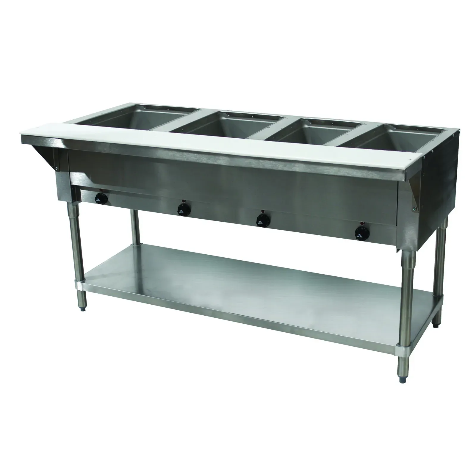 Maintain top hygiene standards using the Advance Tabco Hot Food Table. Designed specifically for restaurant settings, this high-quality unit, model SW-4E-120, ensures your hot food items are kept at optimal serving temperatures while maintaining a clean and organized workspace. With dimensions of 62-7/16"W x 30-5/8"D x 34-1/8"H, the Advance Tabco Hot Food Table features four 12" x 20" sealed wells, each equipped with individual drain valves. These wells can accommodate pan inserts up to 6" deep, providing flexibility for various food items. The individual infinite controls with indicator lights allow precise temperature management for each well, ensuring your dishes are always served at their best. The 3/8" thick poly cutting board offers a convenient prep area, while the stainless steel well liners ensure durability and easy cleaning. The galvanized open base with an undershelf provides additional storage space, keeping your kitchen organized and efficient. Certified by UL and NSF, the Advance Tabco Hot Food Table meets the highest standards of safety and sanitation, making it an essential addition to any professional kitchen. Elevate your food service operations with this reliable and versatile hot food table, designed to meet the rigorous demands of a busy restaurant environment.