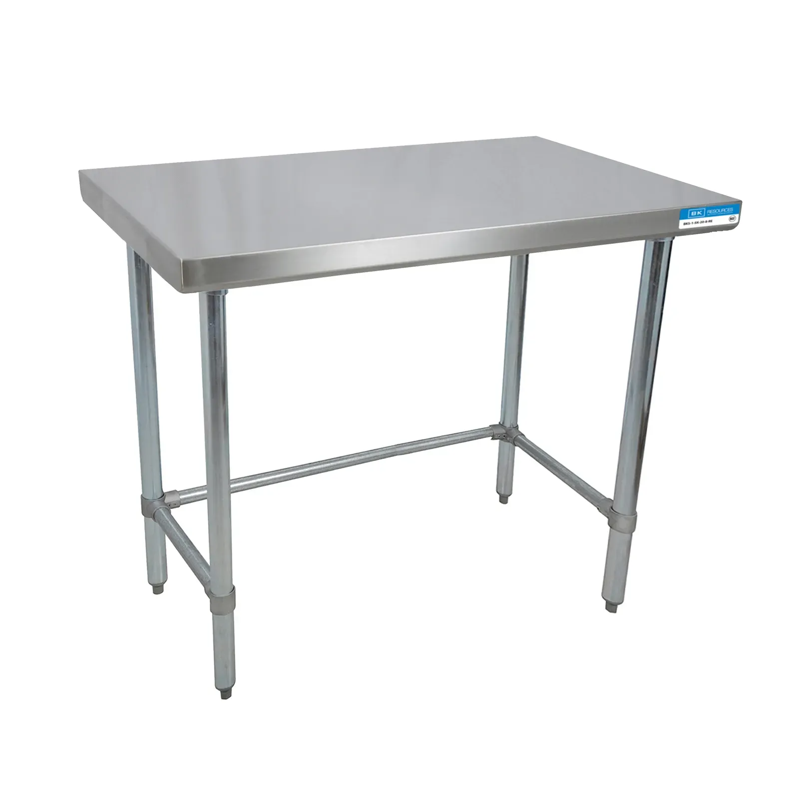 Introducing the BK Resources SVTOB-7230 Work Table, the ultimate tool to dominate the culinary world. This work table is designed to meet the demanding needs of commercial restaurants, ensuring efficiency and durability. With its 18/430 stainless steel top, turndown edges on all sides, and reinforced channels, this work table is built to withstand the rigors of a busy kitchen. The open base, stainless steel side, and rear bracing provide stability and strength, while the 1-5/8" dia. stainless steel legs and adjustable bullet feet allow for easy customization and leveling. Whether you need a spacious surface for food preparation or a sturdy station for equipment, this work table has got you covered. It ships KD for convenience and is NSF certified for food safety. Elevate your restaurant's productivity with the BK Resources SVTOB-7230 Work Table.