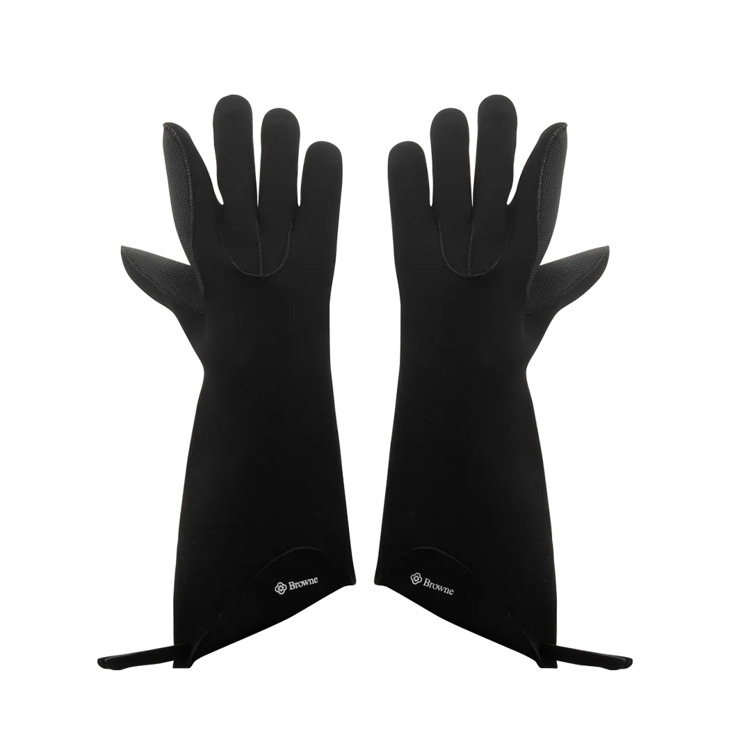 Set apart with innovative solutions, Browne Foodservice presents the 5430502 Safety - KITCHEN GRIPS. Designed for commercial restaurant use, this 5 Finger Glove is a must-have for any professional kitchen. With a length of 15 inches (38cm), it provides ample coverage and protection for your hands. The glove is made from FLXaPrene material, which offers superior heat resistance and flexibility. Its black color adds a sleek and professional touch to your kitchen attire. Whether you're handling hot pots and pans or working with grills and ovens, the Browne Foodservice 5430502 Safety - KITCHEN GRIPS is the perfect companion to keep your hands safe and comfortable in a busy restaurant environment.