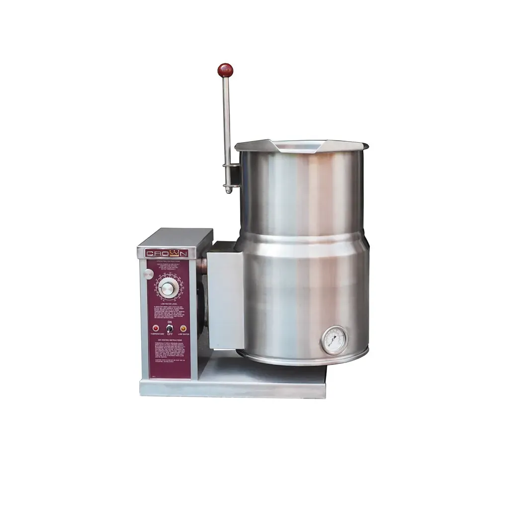 Introducing the EC-6TWL, EC-10TWL, and EC-12TWL – state-of-the-art self-generating electric tilting kettles, designed for optimal performance and convenience. With a thoughtfully positioned tilt console on the left side, these kettles are engineered for superior usability. Each kettle features a robust double-wall interior that creates an efficient steam jacket around the lower two-thirds, ensuring uniform heat distribution. This steam jacket is filled with factory-sealed distilled water, offering both safety and reliability. The hemispherical bottom design enhances heat circulation, allowing for rapid and even cooking. Built to last, these kettles rest on a stainless steel rectangular base that includes concealed mounting lugs, delivering a sleek appearance while maximizing stability. The removable operating handle, featuring a heat-proof knob, provides you with ultimate control and ease of use. Constructed entirely from high-quality #4 finish stainless steel (type 304) for durability, the interior cooking surface is crafted from type 316 stainless steel, ensuring exceptional resistance to corrosion and long-lasting performance. The kettles meet ASME Code standards, are National Board Registered, c-CSA-us certified, and NSF certified, underscoring their reliability and compliance with industry standards. Our kettles are equipped with advanced, water-resistant controls that are integrally mounted for easy access. These controls include a power switch, solid-state thermostat, pilot light, vacuum/pressure gauge, safety valve, and low water shut-off with an indicator light for each kettle, ensuring both safety and convenience during operation. Designed to operate within a wide temperature range of 165°F to 285°F (74°C to 140°C) and withstand maximum pressures of up to 50 psi (345 kPa), these kettles are the perfect solution for any professional kitchen. Additionally, each kettle comes standard with removable heating elements, making maintenance and cleaning a breeze. Elevate your culinary experience with the unmatched quality and performance of the EC-6TWL, EC-10TWL, and EC-12TWL tilting kettles. Invest in the future of cooking today!