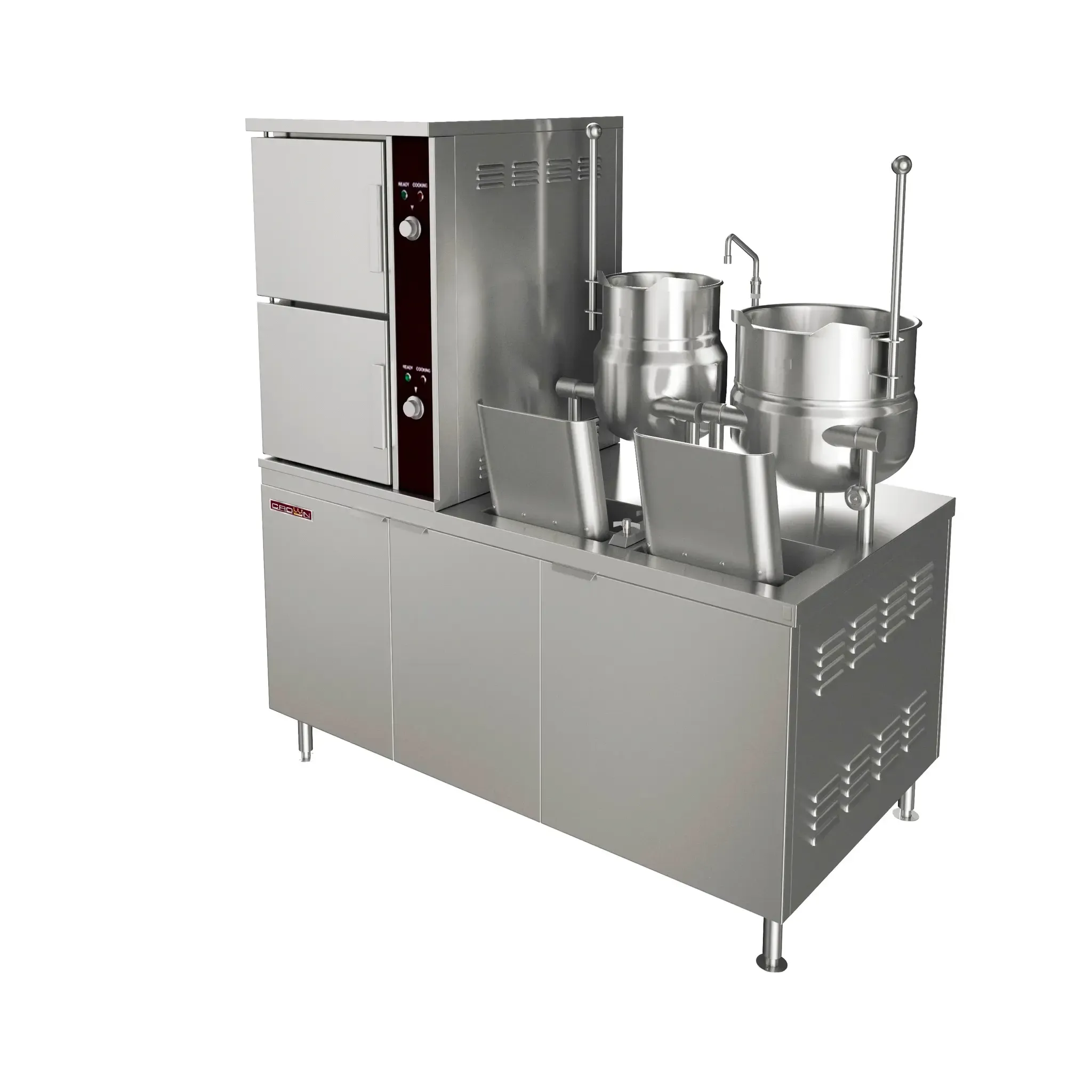 Introducing the Crown convection steamers, a powerful combination of functionality and advanced design, featuring two tilting kettles mounted on a robust modular electric steam boiler base. Crafted from premium type 304 stainless steel with a sleek #4 finish, these steamers include a deck-mounted faucet valve, a convenient swing nozzle, and an integral sink with a common drain, ensuring efficiency and ease of use in any kitchen setting. Designed for optimal performance, the convection steamer doors boast removable inner liners crafted from high-quality stainless steel and include a full perimeter gasket seal. The outer shell is constructed from a single piece of all-welded stainless steel, providing durability and integrity. A positive lock and seal mechanism, along with a stainless steel drip trough that connects to the drain, effectively collects condensate whenever the doors are opened, maintaining a clean and safe working environment. Each cooking chamber is meticulously constructed from all-welded type 316 stainless steel, fully insulated and fitted with removable stainless steel pan supports, ensuring longevity and ease of cleaning. Steamer controls are strategically placed for convenience, accessible through a fully removable side panel. Each compartment features a 60-minute mechanical timer with both ready and cooking pilot lights. The innovative design interrupts steam flow to the chamber when the door is opened during the cooking cycle, automatically resuming steam flow upon closing. An audible signal clearly marks the end of the cooking cycle, adding to the unit's user-friendly functionality. The cabinet base, housing the electric boiler and controls, is engineered with a full perimeter painted angle frame and reinforced mounts for the kettle and boiler. Its hinged doors feature a magnetic latch for secure closure, and the six-inch (152 mm) stainless steel legs are accompanied by four adjustable flanged feet for steadfast support on the floor. The comprehensive boiler controls include automatic water level control, a pressure gauge, water gauge glass, operating pressure control, safety high-limit pressure control, and a safety relief valve, making this unit as safe as it is efficient. With a standard water treatment system, split water line, CSD-1 boiler controls, and automatic blowdown, this unit provides everything necessary for peak performance. The boiler is proudly ASME code stamped and registered with the National Board, ensuring the highest standards of safety and reliability are met. Invest in the Crown convection steamers for a seamless, powerful cooking experience that enhances your kitchen's productivity and quality.