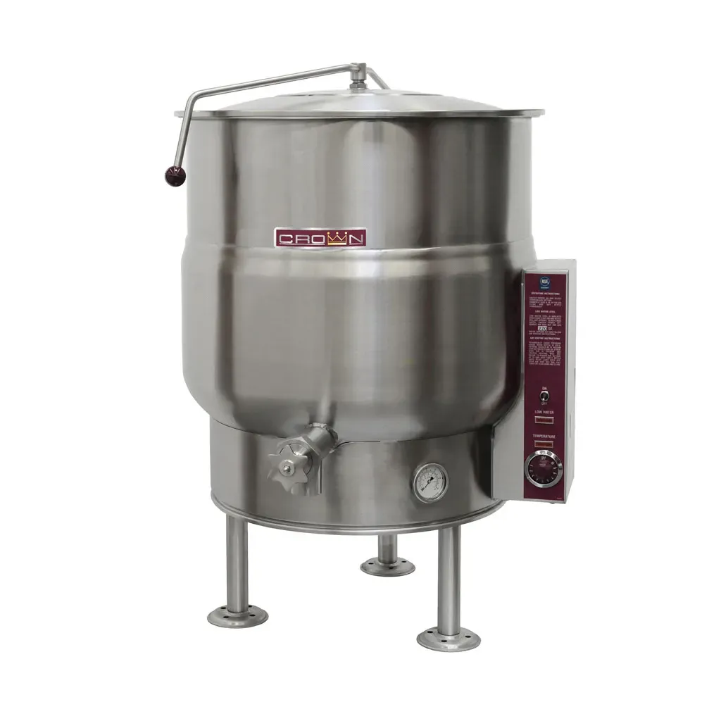 Introducing the Crown kettles, a cutting-edge solution for culinary excellence. Designed with a double-walled interior, these kettles feature a steam jacket that surrounds the lower two-thirds, ensuring optimal heating efficiency. The factory-sealed jacket is filled with distilled water for consistent performance. The innovative hemispherical bottom design enhances heat circulation, delivering superior cooking results every time. Built to last, this unit is constructed from durable, all-welded type 304 stainless steel with a sleek #4 finish. The interior is crafted from standard 316 stainless steel, specifically engineered for high-acid cooking applications. User-friendly controls are integrally mounted and include a power switch, thermostat, pilot light, low water indicator, vacuum/pressure gauge, safety relief valve, and low water shut-off—providing you with all the safety and convenience you need. Each kettle comes equipped with removable heating elements, maximizing versatility in your kitchen. Enjoy additional convenience features like a 2-inch (50 mm) sanitary draw-off valve with a perforated strainer and a spring-assisted hinged stainless steel domed cover for easy access. With a temperature range of 165°F to 285°F (74°C to 140°C) and a maximum pressure of 50 psi (345 kPa), the Crown kettle is engineered to meet the demands of any commercial kitchen. Elevate your cooking with the reliability and innovation of Crown kettles, designed to enhance your culinary creations.