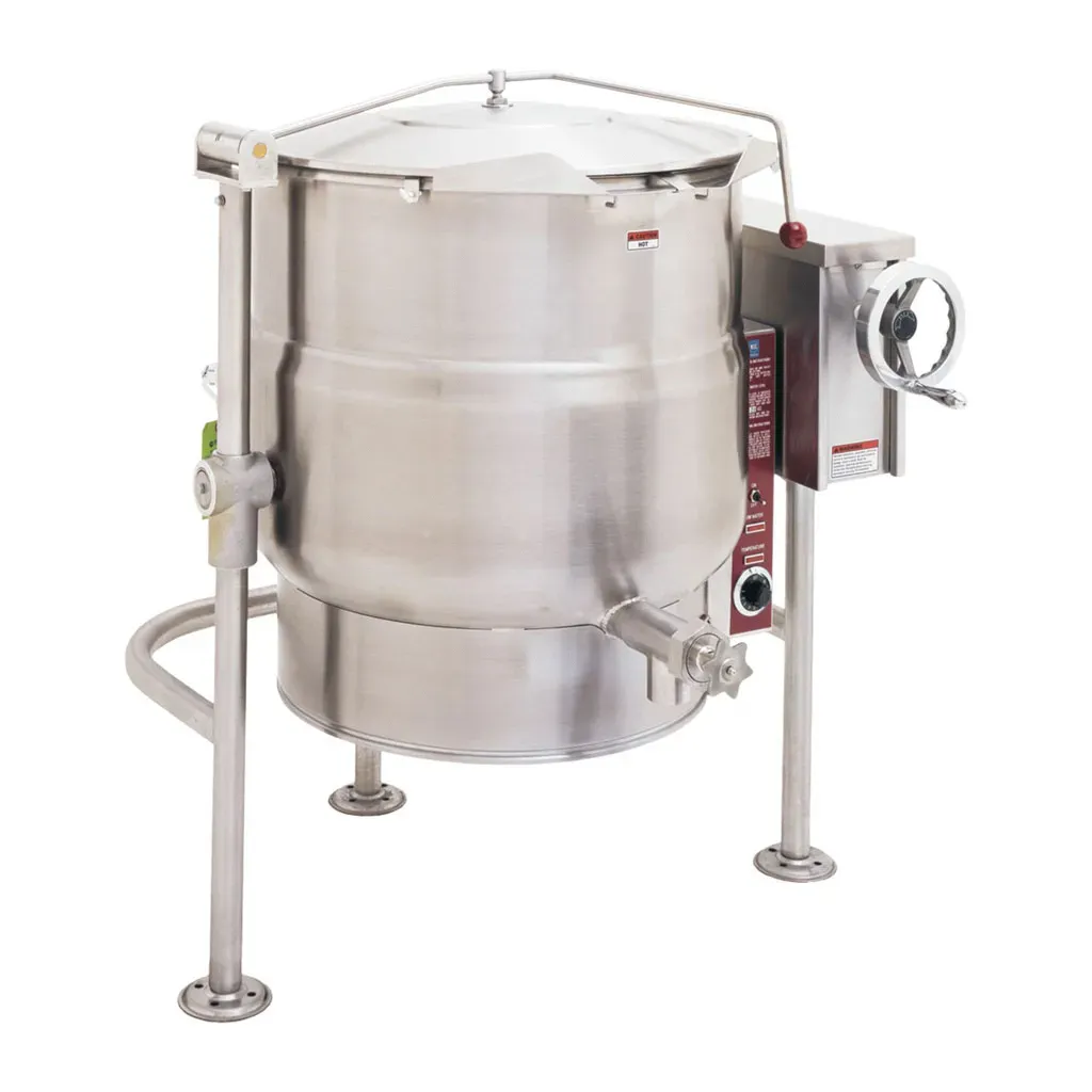 Discover the unmatched efficiency and performance of the Crown kettle line. With its innovative double-wall interior design, which creates a steam jacket around the lower two-thirds of the kettle, this system ensures optimal heat distribution. The factory-sealed jacket contains distilled water, providing reliable and consistent heating for all of your cooking needs. The hemispherical bottom enhances heat circulation, allowing for uniform cooking results every time. Constructed from drip-proof stainless steel, the sturdy console is supported by a fully welded frame made from 1-5/8” (41 mm) diameter stainless steel pipe legs, complete with adjustable flanged feet for secure floor attachment. Experience unrivaled convenience with a kettle that tilts forward a full 90°, thanks to a trunnion and tilt mechanism that ensures complete emptying. The self-locking tilt mechanism guarantees stability while in use. Durability and quality are paramount, as the entire unit features all welded #4 finish stainless steel, type 304, with a type 316 stainless steel interior liner that excels in high-acid cooking applications. The integrally mounted controls—complete with a power switch, thermostat, pilot light, low water indicator, vacuum/pressure gauge, safety relief valve, and low water shut-off—make operation straightforward and efficient. Furthermore, the standard removable heating elements provide flexibility and ease of maintenance. Operating within a temperature range of 165°F to 285°F (74°C to 140°C) at a maximum pressure of 50 psi (345 kPa), this kettle is designed to handle the demands of any commercial kitchen. Don’t miss out on the opportunity to enhance your cooking capabilities with the Crown kettle line!