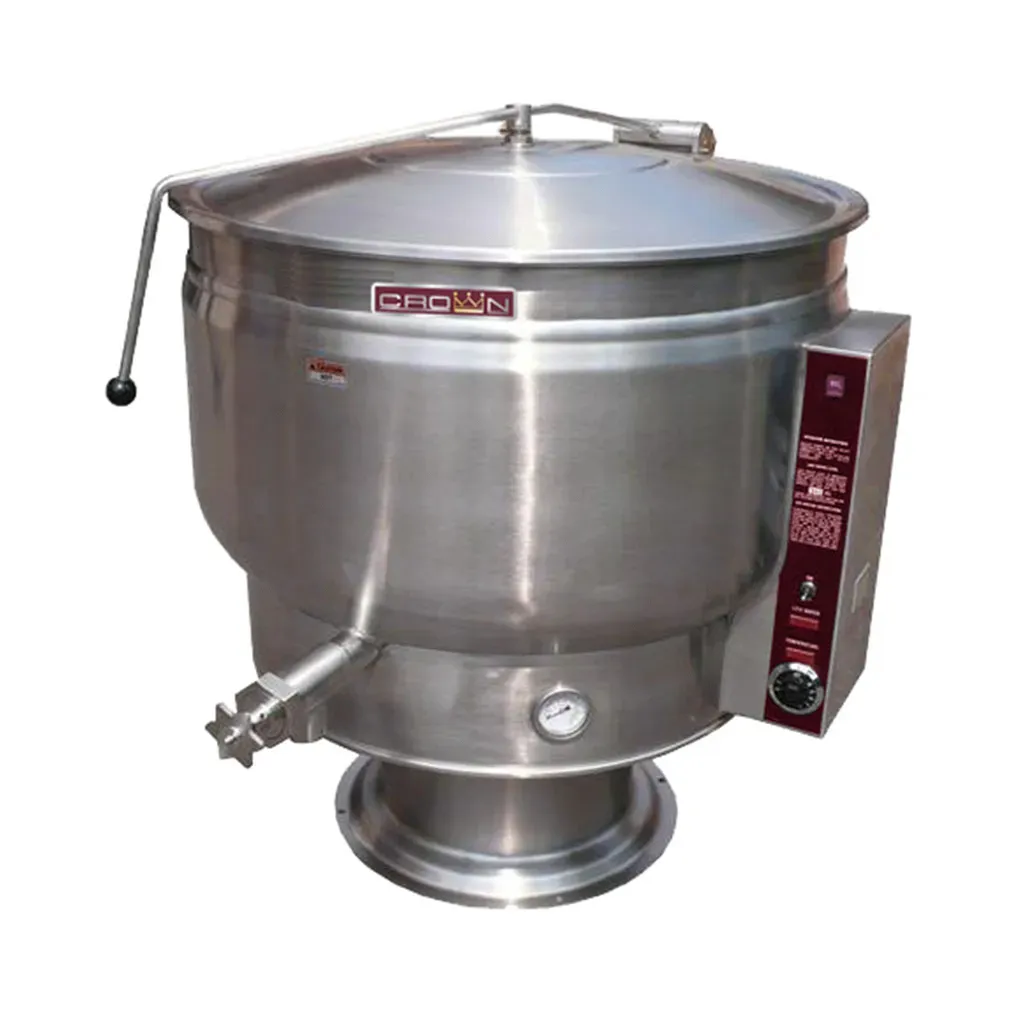 The Crown line of self-generating, electric, full-jacket kettles is designed for superior performance and reliability. These low-height pedestal kettles feature a double-wall interior that forms a full steam jacket around the entire kettle, ensuring efficient heat transfer and uniform cooking. The steam jacket is filled with factory-sealed distilled water for optimal heat retention. The kettle’s hemispherical bottom design allows for superior heat circulation, making it ideal for a variety of cooking applications. The pedestal base is built for stability, with four 7/16” holes evenly spaced for secure mounting to the floor. Constructed from all-welded, #4 finish type 304 stainless steel, the kettle is durable and easy to clean, while the interior liner is made from high-quality 316 stainless steel, perfect for high-acid cooking applications. The unit comes with integrally mounted controls that include a power switch, thermostat, pilot light, low water light, vacuum/pressure gauge, safety relief valve, and low water shutoff, providing ease of operation and enhanced safety. A faucet bracket is also standard for added convenience. For added functionality, the kettle includes removable heating elements, a 2” (50 mm) sanitary draw-off valve, and a spring-assisted, hinged stainless steel domed cover. Certified with ASME Code, National Board Registration, c-CSA-us, and NSF, this kettle meets the highest standards of safety and quality. Operating within a temperature range of 165°F to 285°F (74°C to 140°C) and a maximum pressure of 50 psi (345 kPa), it delivers reliable, high-performance cooking every time.