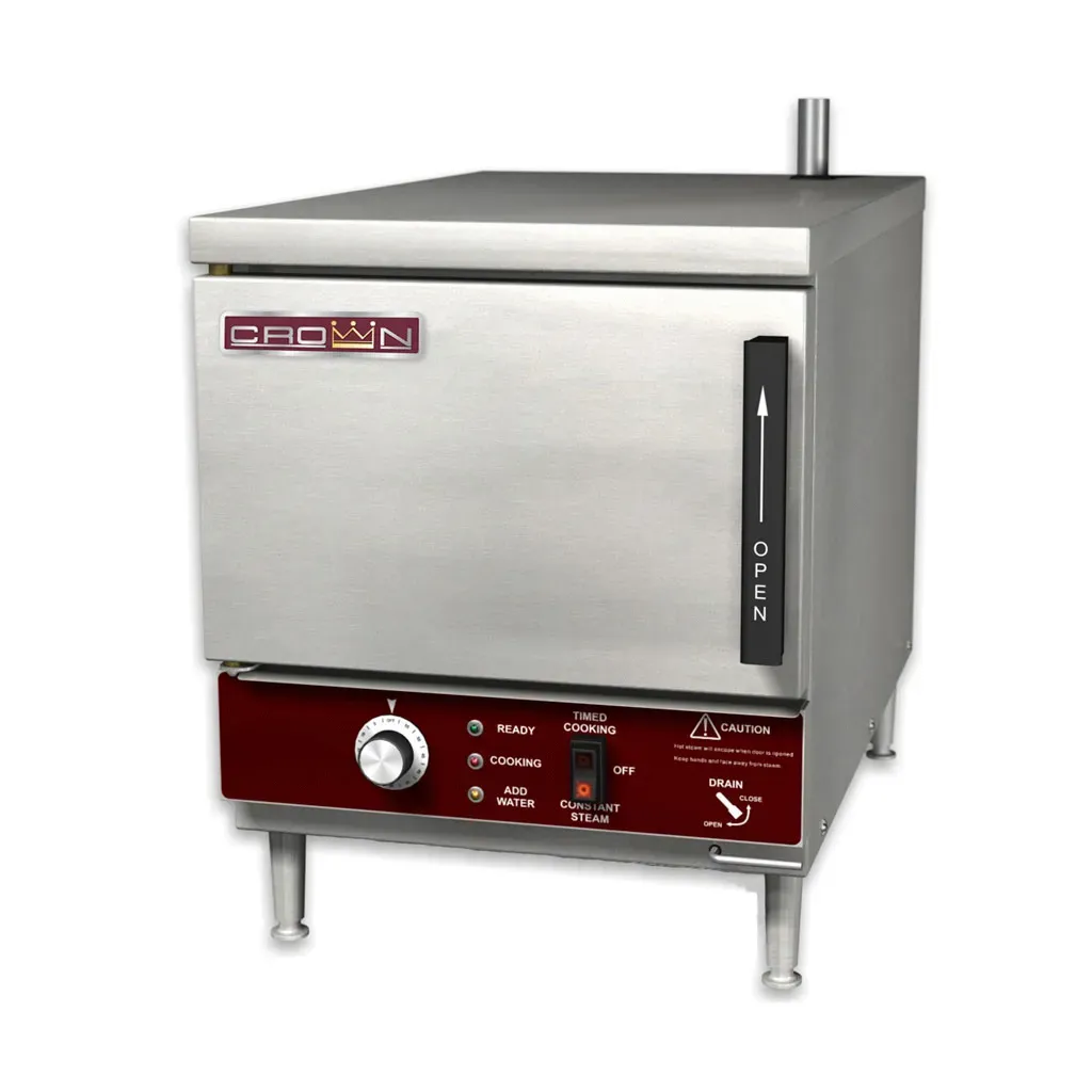 The EPXN-3 (3-pan) and EPXN-5 (5-pan) are countertop, boiler-free convection steamers designed for commercial kitchens that demand high efficiency and ease of use. These units are connectionless, meaning no plumbing is required, offering a flexible solution for kitchens of all sizes. Certified by c-CSA-us and NSF, the EPXN series ensures safety, durability, and top-tier performance. Constructed with a satin-finish 304 stainless steel exterior, these steamers feature a one-piece, welded 316 stainless steel cooking chamber with coved corners for easy cleaning and long-lasting durability. The door is built with a removable inner stainless steel liner and a full perimeter gasket seal to ensure a tight, energy-efficient closure. The outer door liner is made from one-piece welded stainless steel, featuring a positive lock and seal mechanism with a spring release for hassle-free operation. The EPXN units come equipped with removable stainless steel pan supports and a steam diffuser plate, ensuring even steam distribution and consistent results. The control housing is constructed from stainless steel and includes a full-access removable panel for easy maintenance. The controls are designed for ease of use, featuring an illuminated timed cooking/off/constant steam switch, a ready indicator light, a cooking indicator light, and a 60-minute electric timer with an audible alarm that signals the end of the cooking cycle. Additionally, a low water indicator light with an audible alarm alerts the user when water levels are too low. For added safety, a door interlock switch interrupts steam generation when the door is open and automatically reactivates when the door is closed. Perfect for kitchens looking for efficient, high-performance steamers without the need for plumbing, the EPXN-3 and EPXN-5 offer a practical, reliable solution for everyday steaming tasks.