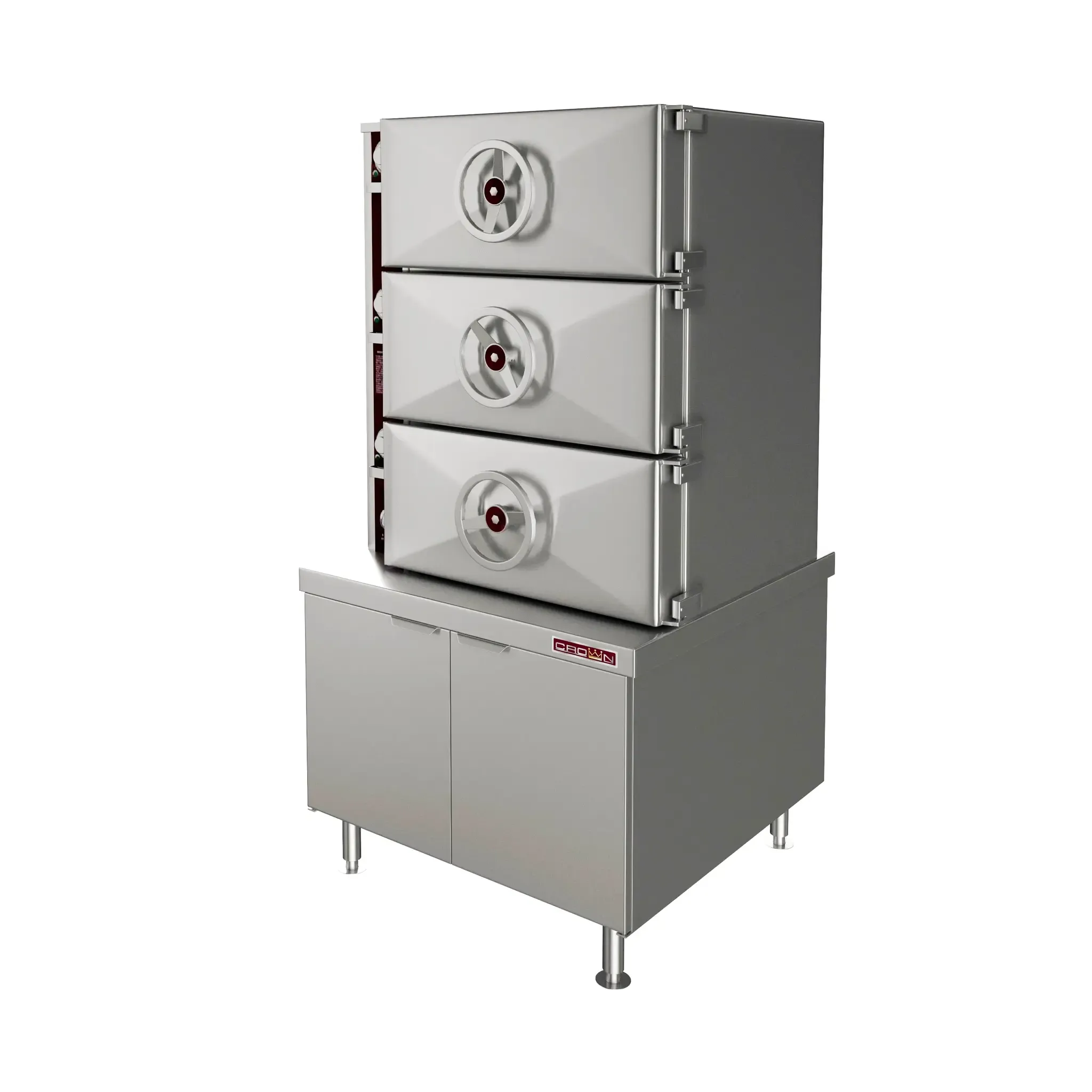 The GC-2 and GC-3 are high-performance pressure compartment cookers featuring a gas steam boiler, designed to meet the demands of commercial kitchens. These units are constructed from all-welded type 304 stainless steel with a #4 finish, ensuring both durability and easy cleaning. The doors are built with a removable aluminum plate inner liner, a full perimeter gasket seal, and a one-piece welded stainless steel outer shell. The wheel-and-screw closing mechanism ensures a secure and tight seal. The doors feature a clear opening of 10-1/4” x 26-3/8” (260 mm x 670 mm) and can open 180 degrees upon latch release for easy access. Each compartment operates at a maximum pressure of 6 psi (41 kPa) and includes universal pan supports. Optional sliding shelves are available to support two full-size (1/1 gastronorm) pans, providing versatile cooking options. The control housing is constructed from #4 finish stainless steel and includes a full-access removable panel for ease of maintenance. Each compartment is independently controlled by an automatic timer with visible and audible signals. At the end of the cooking cycle, the controls automatically shut off, exhaust the incoming steam, drain the condensate from the compartment, and activate a continuous audible signal until manually turned off. The cooker is mounted on a sturdy cabinet base with a full perimeter angle frame and reinforced counter and boiler mountings. The electric boiler features standard controls, including automatic water level control, a pressure gauge, water gauge glass, pressure control with secondary safety pressure control, air vent, and safety relief valve. For optimal safety and efficiency, thermostatically controlled cold water automatically condenses the exhausted steam before releasing it to the drain. The cabinet is made from durable, #4 finish type 304 stainless steel, with hinged doors and 6” (152 mm) stainless steel legs fitted with adjustable flanged feet for secure mounting to the floor. A comprehensive water treatment system, automatic blowdown, CSD-1 boiler controls, electronic ignition, and a split water line come standard, ensuring top-tier performance and safety for every cook cycle.