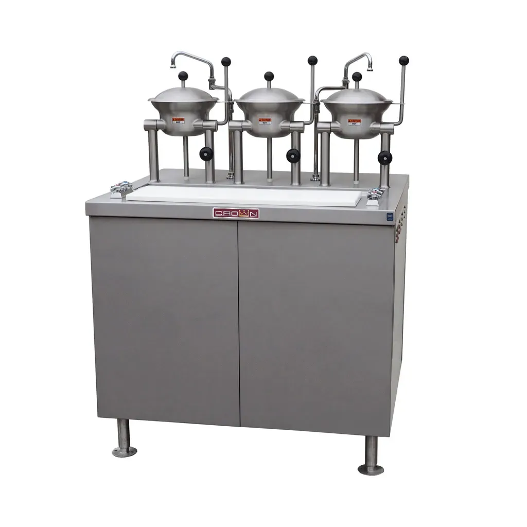 The Crown Oyster Cookers feature a type 316 stainless steel inner and outer shell with a #4 finish, offering a one-piece welded construction. Each 2-quart cooker includes a tilt handle and heat-resistant knob, allowing the cooker to tilt 90° for complete emptying. The stainless steel mounting legs house the steam supply and condensate, with the right leg fitted with a steam control valve. A stainless steel lift-off cover comes standard. The cookers are mounted on a cabinet base with a full perimeter angle frame, reinforced counter, and a spillage sink with drain and drain screen. The base includes boiler mountings, an electric boiler with controls, hinged doors with magnetic catches, and removable side panels. 6” (152 mm) stainless steel legs with 4 adjustable flanged feet secure the unit to the floor. The exterior is finished with #4 stainless steel. The steam manifold is concealed within the cabinet and equipped with a steam trap and safety relief valve. The unit comes standard with automatic boiler blowdown, CSD-1 boiler controls, and a split water line.