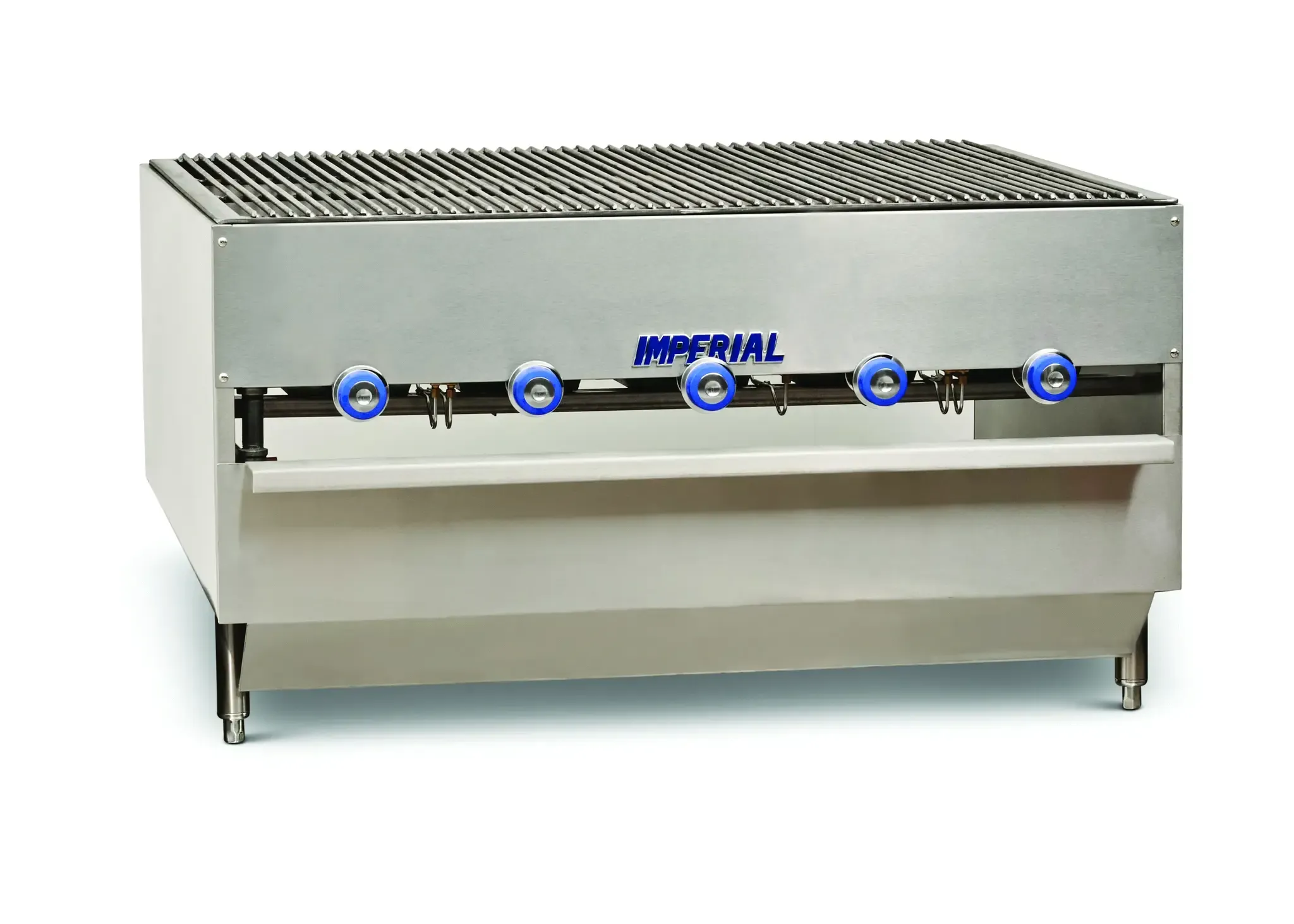 Ignite culinary passion with the Imperial ICB-4836 Chicken Charbroiler. This gas countertop charbroiler is a must-have for any commercial restaurant. With its 48" size and 5 radiant "H" burners, it provides ample space and even heat distribution for grilling chicken to perfection. The round rod grates ensure beautiful grill marks and enhance the flavor of the chicken. Made with a stainless steel front and sides, this charbroiler is not only durable but also easy to clean. The 36"D broiling surface allows for large quantities of chicken to be cooked at once, making it ideal for busy restaurant kitchens. With 250,000 BTU of power, this charbroiler delivers high-performance grilling every time. The 4" legs provide stability and allow for easy placement on any countertop. NSF certified, this Imperial Chicken Charbroiler guarantees safety and quality. Upgrade your restaurant's grilling capabilities with the Imperial ICB-4836 Chicken Charbroiler.