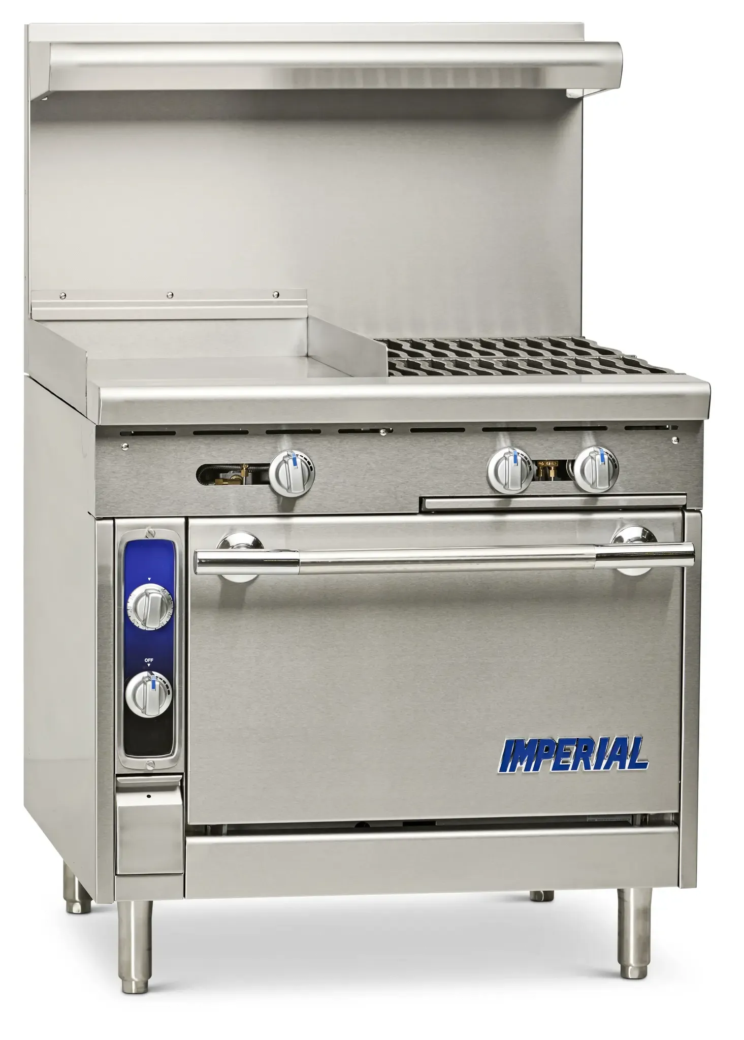 Cook with precision using the Imperial, IHR-G18-2-XB Range. This Diamond Series Heavy Duty Range is designed for commercial restaurant use, offering exceptional performance and durability. With two open burners and an 18" griddle, this range provides versatile cooking options to meet the demands of a busy kitchen. The cast iron grates ensure even heat distribution, while the manual controls allow for precise temperature adjustments. The open cabinet and bottom shelf provide convenient storage space for cookware and utensils, keeping everything within reach. The stainless steel construction of the front, sides, landing ledge, backguard, and kick plate ensures easy cleaning and long-lasting durability. Equipped with a 4"W grease gutter and removable crumb tray, this range makes cleaning up a breeze. With 110,000 BTU of power, this range delivers exceptional cooking performance. Trust the Imperial, IHR-G18-2-XB Range to elevate your restaurant's culinary capabilities.