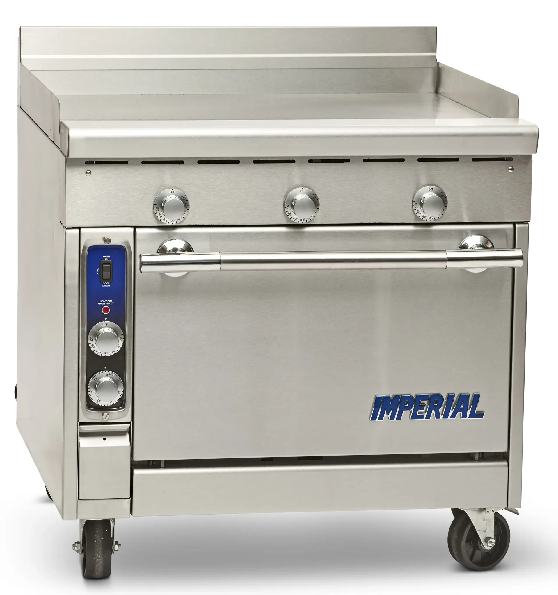 Optimize your kitchen efficiency with the Imperial, IHR-GT36-E-C, Range, 36" Heavy Duty, Electric. This heavy-duty range is designed to meet the demands of a commercial restaurant, ensuring smooth operations and exceptional performance. The 36" griddle provides ample cooking space, allowing you to prepare multiple dishes simultaneously. With thermostatic controls, you have precise control over the cooking temperature, ensuring consistent results every time. The convection oven features three chrome racks, providing plenty of space for baking and roasting. The 4"W grease trough and removable grease can make cleaning a breeze, while the porcelain oven interior ensures durability and easy maintenance. Made with stainless steel front, sides, backguard, kick plate, and landing ledge, this range is built to withstand the rigors of a busy kitchen. The adjustable feet and 6" legs offer stability and flexibility in installation. Trust the Imperial, IHR-GT36-E-C, Range, 36" Heavy Duty, Electric to enhance your restaurant's productivity and deliver exceptional culinary creations.