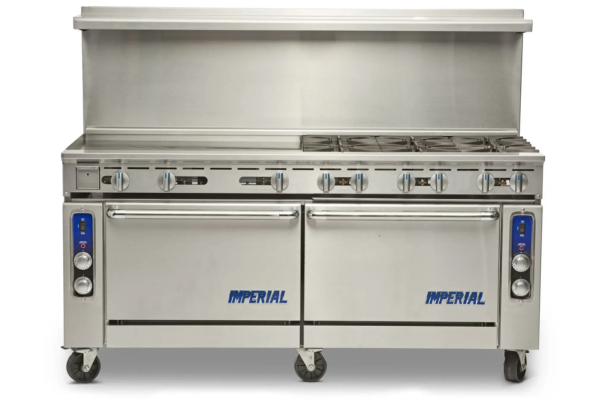 Create culinary magic with the Imperial IR-12 Range, a 72" gas restaurant range that is designed to elevate your culinary creations to new heights. This range features 12 open burners, allowing you to simultaneously cook multiple dishes with precision and efficiency. The two standard ovens are equipped with a chrome rack per oven, providing ample space for baking and roasting. The removable crumb tray makes cleaning a breeze, ensuring that your kitchen stays clean and organized. Crafted with a stainless steel front, sides, backguard, shelf, landing ledge, and kick plate, this range is not only durable but also adds a touch of elegance to your restaurant's kitchen. The adjustable feet and 6" legs provide stability and flexibility, allowing you to customize the range to fit your kitchen's needs. With a powerful 454,000 BTU, this NSF, CE, CSA Flame, and CSA Star certified range is a reliable and efficient addition to any commercial restaurant. Elevate your culinary experience with the Imperial IR-12 Range.