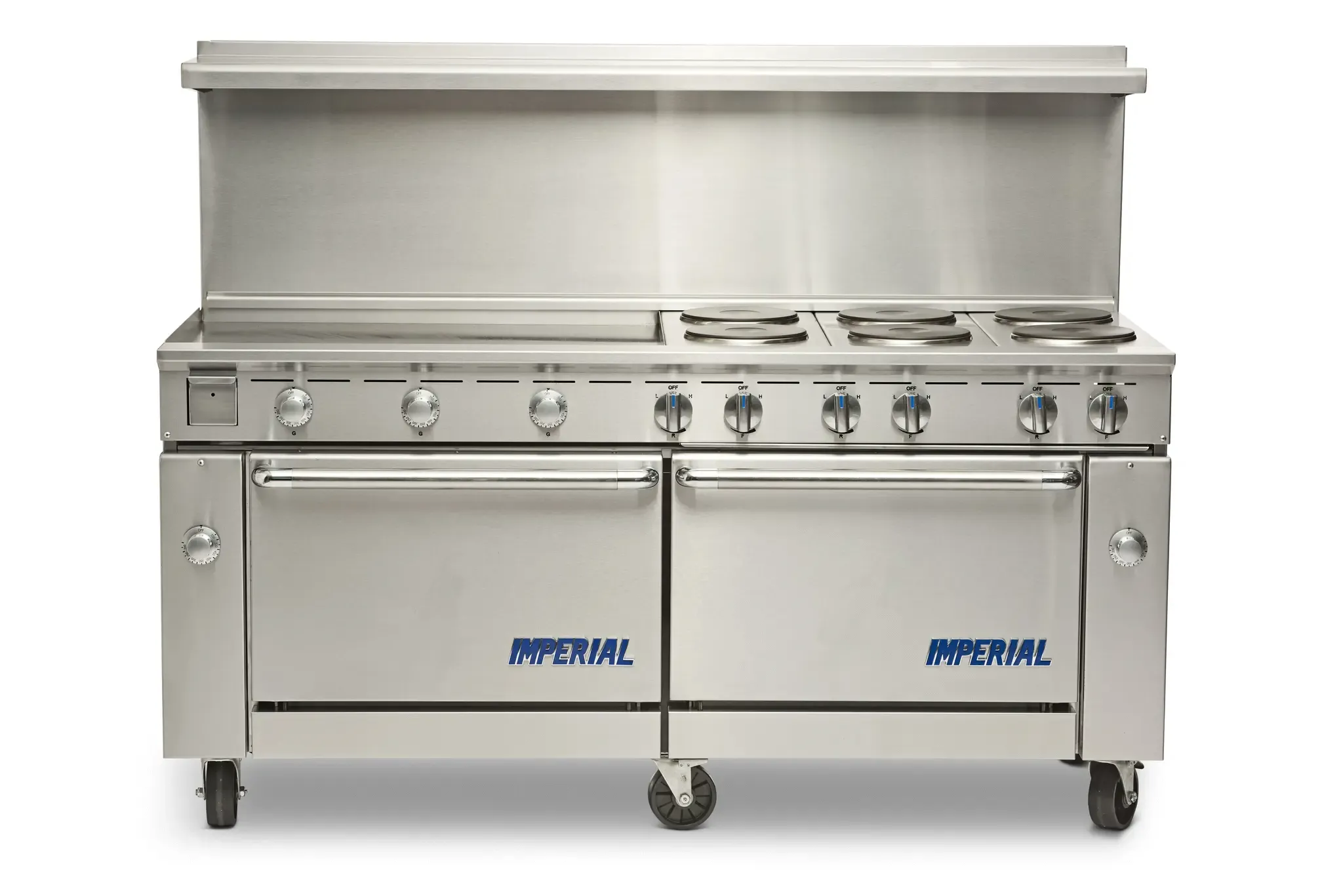 Experience kitchen innovation with the Imperial IR-8-G24T-E Range, a top-of-the-line electric restaurant range designed to meet the demands of a busy commercial kitchen. This 72" range features eight round elements, perfect for cooking multiple dishes simultaneously. It also includes a 24" thermostatic griddle, allowing you to achieve precise cooking temperatures for delicious results every time. With two standard ovens, you'll have plenty of space to bake, roast, and broil your culinary creations. The porcelain oven interior ensures easy cleaning, while the stainless steel front, sides, backguard, landing ledge, and kick plate provide durability and a sleek appearance. The range also comes with a splatter screen to keep your kitchen clean and safe. With infinite heat controls and adjustable feet, this range offers versatility and convenience. Trust the Imperial IR-8-G24T-E Range to elevate your restaurant's cooking capabilities and deliver exceptional dishes to your customers.