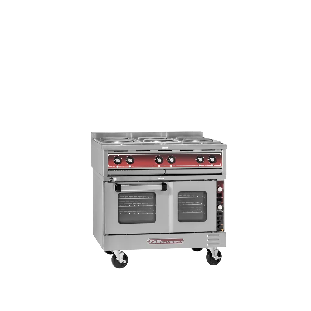 Unleash gastronomic brilliance with the Southbend SE36T-BBB Range, a heavy-duty electric range designed to elevate your restaurant's culinary creations. This range features six round hotplates, each equipped with a three-heat switch, allowing for precise temperature control and efficient cooking. The TruVection oven, complete with three racks, ensures even heat distribution for perfectly baked goods every time. The stainless steel front, sides, top, and oven lining not only provide durability but also give your kitchen a sleek and professional look. With 6" legs, this range is easy to clean underneath, maintaining a hygienic environment. As part of Southbend's Service First Program, you can expect exceptional customer support and assistance. Whether you're saut ing, simmering, or baking, the Southbend SE36T-BBB Range is the ideal companion for any commercial restaurant, delivering outstanding performance and reliability.