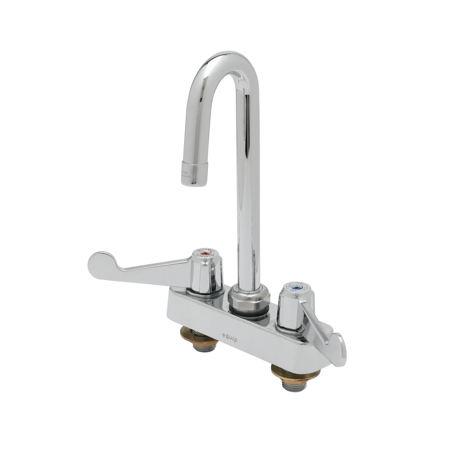 Secure System Operation with T&S Brass, 5F-4CWX05A, Faucet, Deck Mount. This deck mount mixing faucet is a must-have for any commercial restaurant. With its polished chrome plated brass body, it not only adds a touch of elegance to your establishment but also ensures durability and longevity. The 5 9/16" equip swivel gooseneck with a 2.2 GPM aerator provides flexibility and convenience, allowing you to easily fill pots and pans of various sizes. The quarter-turn ceramic cartridges offer smooth and precise control over water flow, reducing the risk of leaks and drips. Designed by T&S Brass, a trusted name in the industry, this faucet guarantees reliable performance and peace of mind. Whether you're running a busy kitchen or a bustling bar, this deck mount faucet is the perfect choice for secure and efficient system operation.