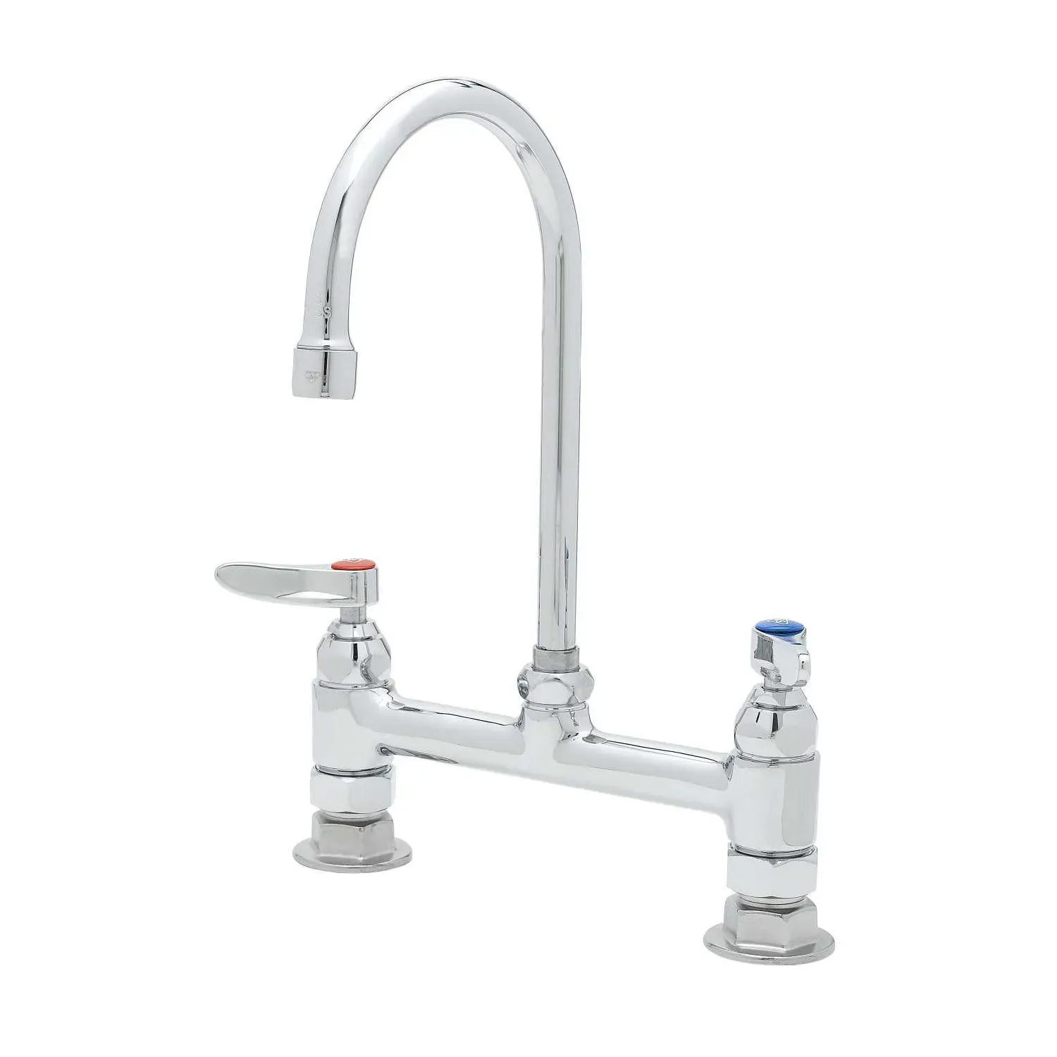 Secure Operational Integrity with the T&S Brass B-0320 Faucet, Deck Mount. This double pantry faucet is designed to meet the demands of a commercial restaurant setting, ensuring reliable performance and durability. With its 8" centers and swivel/rigid gooseneck, this deck mount faucet offers flexibility and convenience for various tasks in the kitchen. The lever handles provide easy control and precise water flow adjustment, allowing chefs and staff to work efficiently. The polished chrome plated brass body not only adds a sleek and professional look to your restaurant's decor but also ensures long-lasting quality. The lock washer provided allows for rigid application, ensuring stability during heavy use. Trust T&S Brass, a reputable vendor known for their high-quality products, to deliver a faucet that meets the rigorous demands of a busy commercial kitchen. Upgrade your restaurant's operational integrity with the T&S Brass B-0320 Faucet, Deck Mount.
