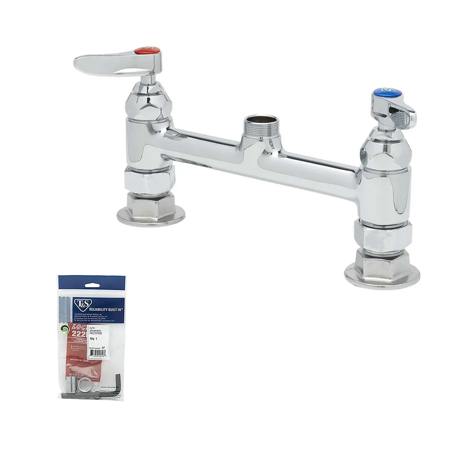 Maintain Equipment Reliability with the T&S Brass B-0320-LN Faucet, Deck Mount. This double pantry swivel/rigid base faucet is designed to meet the demands of a commercial restaurant setting. With its 8" centers and deck mount installation, this faucet provides a sturdy and reliable solution for your kitchen needs. The polished chrome plated brass body ensures durability and longevity, even in high-traffic areas. The swivel outlet accepts T&S swing nozzles and EasyInstall risers, giving you flexibility and ease of use. Plus, the included EZ-K kit allows you to convert rigid risers to EasyInstall, making installation a breeze. Whether you're washing dishes, filling pots, or rinsing produce, the T&S Brass B-0320-LN Faucet is the perfect choice for maintaining equipment reliability in your commercial restaurant.