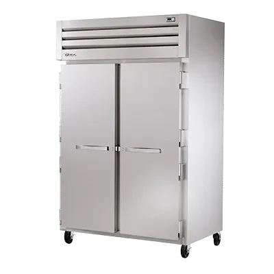 Achieve kitchen supremacy with the True Manufacturing STG2H-2S Heated Cabinet, Reach-In. This top-of-the-line commercial appliance is designed to meet the demanding needs of any restaurant kitchen. With its two-section design and stainless steel doors equipped with locks and cam-lift hinges, this heated cabinet offers both convenience and security. The digital temperature control ensures precise temperature management, while the six chrome shelves provide ample storage space for your culinary creations. Made in the USA, this cabinet features a stainless steel front, aluminum sides, and an aluminum interior, making it durable and easy to clean. The 5" castors allow for easy mobility, and the 3.0 kW power ensures efficient heating. Whether you need to keep food warm or hold pre-cooked meals, the True Manufacturing STG2H-2S Heated Cabinet is the perfect addition to any commercial restaurant kitchen.
