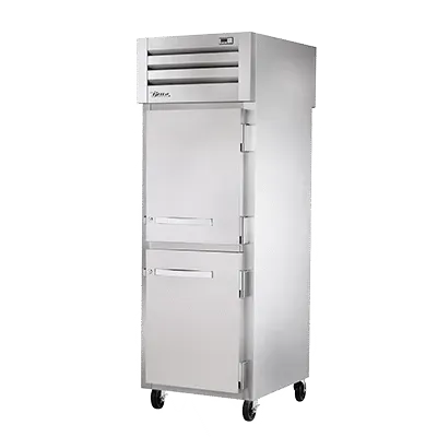 Elevate your culinary experience with the True Manufacturing STR1RPT-2HS-1S-HC Refrigerator, Pass-Thru. This top-of-the-line refrigerator is designed to meet the demanding needs of commercial restaurants. With its sleek stainless steel construction, this unit not only looks professional but is also built to withstand the rigors of a busy kitchen. The pass-thru design allows for easy access from both the front and rear, making it convenient for food preparation and storage. Equipped with two stainless steel half doors in the front and one stainless steel door in the rear, all with locks and cam-lift hinges, you can rest assured that your ingredients will be securely stored. The digital temperature control ensures precise temperature management, while the LED interior lights provide excellent visibility. With its 5" castors, this refrigerator is easy to move and clean. Made in the USA and certified by cULus and UL EPH Classified, this True Manufacturing refrigerator is a reliable and efficient choice for any commercial kitchen.