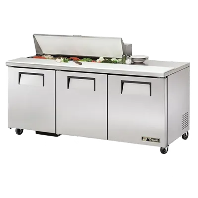 Equip your commercial kitchen with the True Manufacturing TSSU-72-12-HC Refrigerated Counter, Sandwich / Salad Unit. This top-of-the-line unit is designed to meet the demands of a busy restaurant environment. With its stainless steel insulated cover and aluminum interior with a stainless steel floor, this unit ensures optimal temperature control and durability. The unit features (12) 1/6 size poly pans, perfect for storing and organizing your sandwich and salad ingredients. The 11-3/4" cutting board provides a convenient workspace for food preparation. The three full doors and six PVC coated wire shelves offer ample storage space for your ingredients and supplies. Equipped with 5" castors, this unit is easy to move and clean. The TSSU-72-12-HC runs on R290 Hydrocarbon refrigerant and has a 1/2 HP compressor, ensuring energy efficiency and cost savings. Made in the USA, this True Manufacturing unit is cULus and UL EPH Classified, guaranteeing its quality and safety. Upgrade your kitchen with this reliable and efficient refrigerated counter.