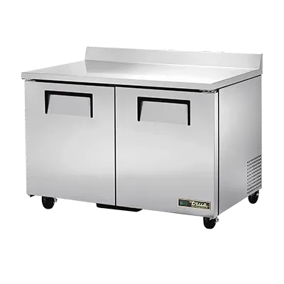 Introducing the True Manufacturing TWT-48-HC Refrigerated Counter, Work Top - the perfect addition to drive restaurant profitability. This two-section work top refrigerator is designed to optimize your commercial kitchen's efficiency and productivity. With its stainless steel top and rear splash, as well as front and sides, this unit is not only durable but also easy to clean. The two stainless steel doors provide ample storage space, while the four PVC coated wire shelves allow for organized storage of ingredients and supplies. The aluminum interior with a stainless steel floor ensures long-lasting performance, even in the busiest kitchen environments. Equipped with 5" castors and a rear mount, this refrigerator is easy to move and position wherever it's needed. Powered by a 1/5 HP motor and utilizing R290 Hydrocarbon refrigerant, this unit is energy-efficient and environmentally friendly. Invest in the True Manufacturing TWT-48-HC Refrigerated Counter, Work Top and experience enhanced productivity and profitability in your restaurant. Made in the USA, this unit guarantees authenticity and quality.