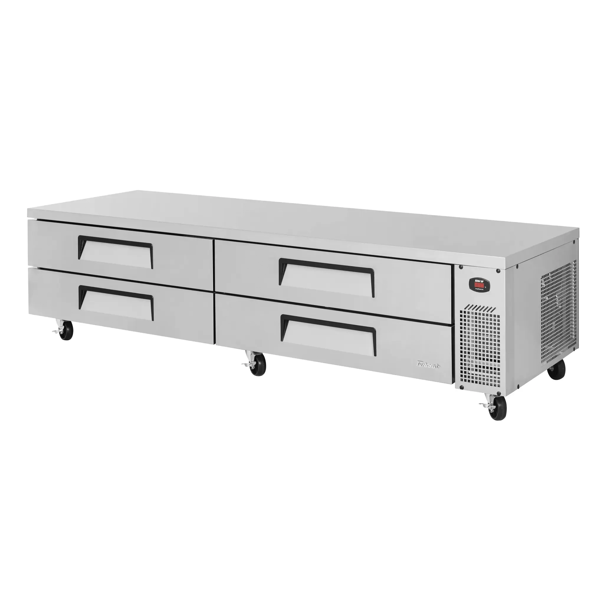 Elevate your culinary experience with the Turbo Air TCBE-96SDR-N Equipment Stand Refrigerated Base. This super deluxe chef base refrigerator is designed to meet the demands of a commercial restaurant kitchen. With a spacious 18.6 cu. ft. capacity and four durable drawers, it offers ample storage for your ingredients. The self-cleaning condenser device ensures optimal performance and reduces maintenance needs. The 16 ga. stainless steel one-piece reinforced insulated top provides durability and insulation, while the stainless steel front and sides add a sleek and professional look to your kitchen. The digital temperature display allows for easy monitoring and control of the refrigeration system. With a 72-pan capacity, this chef base refrigerator is perfect for storing and organizing your ingredients. Plus, it uses R290 Hydrocarbon refrigerant, making it environmentally friendly. Trust Turbo Air to deliver high-quality refrigeration solutions for your commercial kitchen.