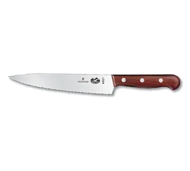 Create a Seamless Culinary Experience with the Victorinox Swiss Army, 5.2030.19-X1 Chef Knife. This professional-grade knife is designed to meet the demands of a commercial restaurant kitchen. With its 7-1/2" wavy edge and stiff blade, it effortlessly slices through meats, vegetables, and fruits, ensuring precise cuts every time. The 1-1/2" width at the handle provides a comfortable grip, allowing for extended use without fatigue. The rosewood handle adds a touch of elegance and durability to the knife, making it a standout in any kitchen. Packaged in a convenient clamshell/peggable package, this knife is ready to be put to work as soon as it arrives. Whether you're a seasoned chef or a culinary enthusiast, the Victorinox Swiss Army Chef Knife is a must-have tool for creating culinary masterpieces in a commercial restaurant setting.